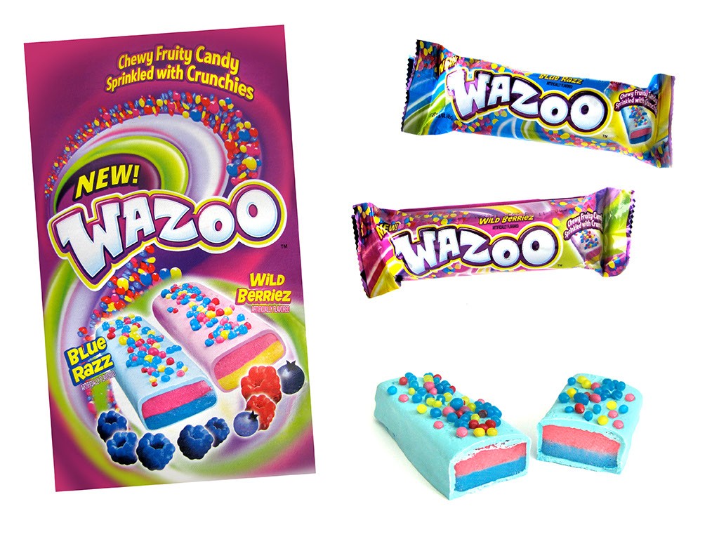 Tangy double layered taffy, a delicious coating & sprinkled with candy crunchies; The Wazoo is the candy bar for kids!